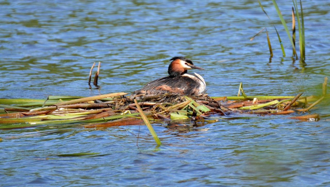 Grèbe huppée flottant sur son nid